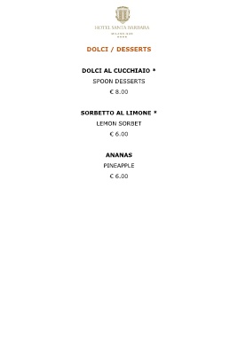 DOLCI / DESSERTS DOLCI AL CUCCHIAIO * SPOON DESSERTS € 8.00 SORBETTO AL LIMONE * LEMON SORBET € 6.00 ANANAS PINEAPPLE € 6.00